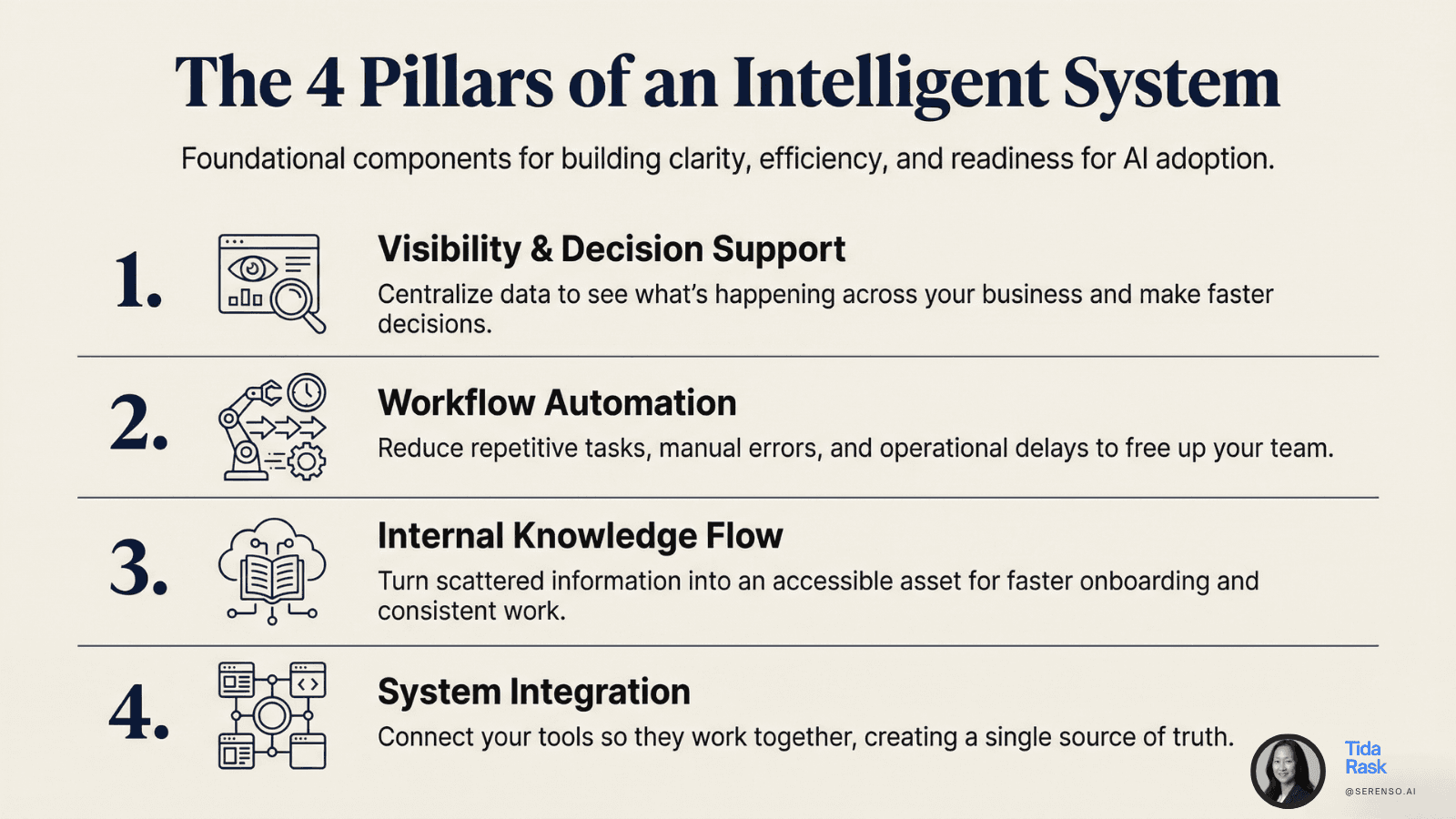 That is where the four pillars of an intelligent system come in. They give you a simple way to understand what your business needs so AI can actually work for you instead of adding to the chaos. They give you a simple way to understand what your business needs so AI can actually help you scale instead of adding to the chaos.