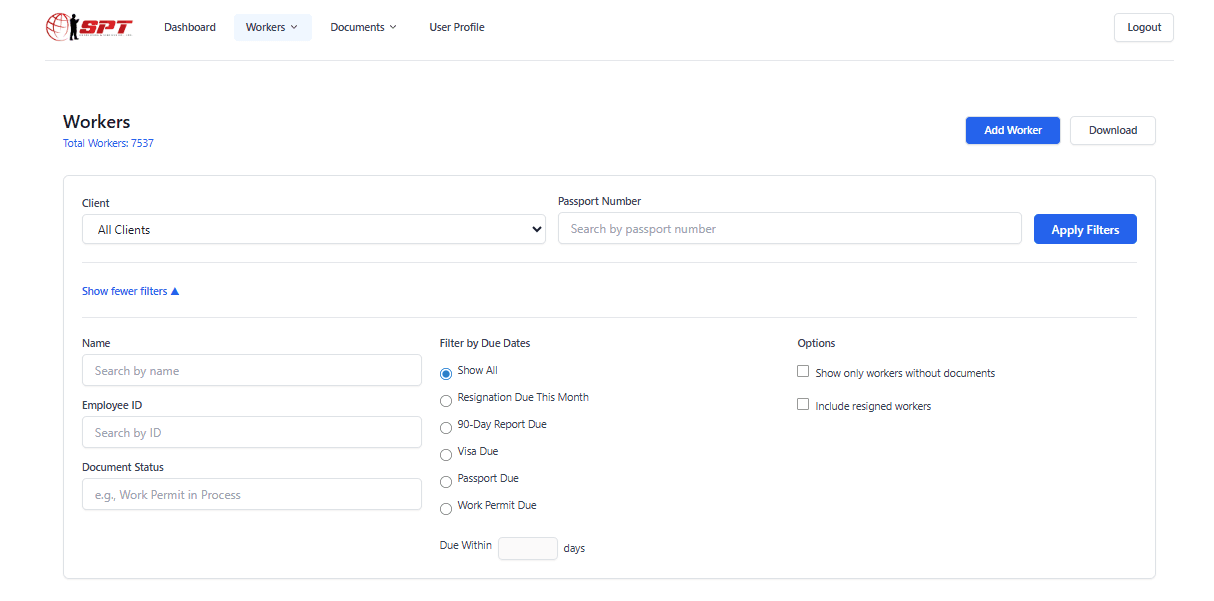 Advanced filtering by client, document status, and expiration dates with role-based access control